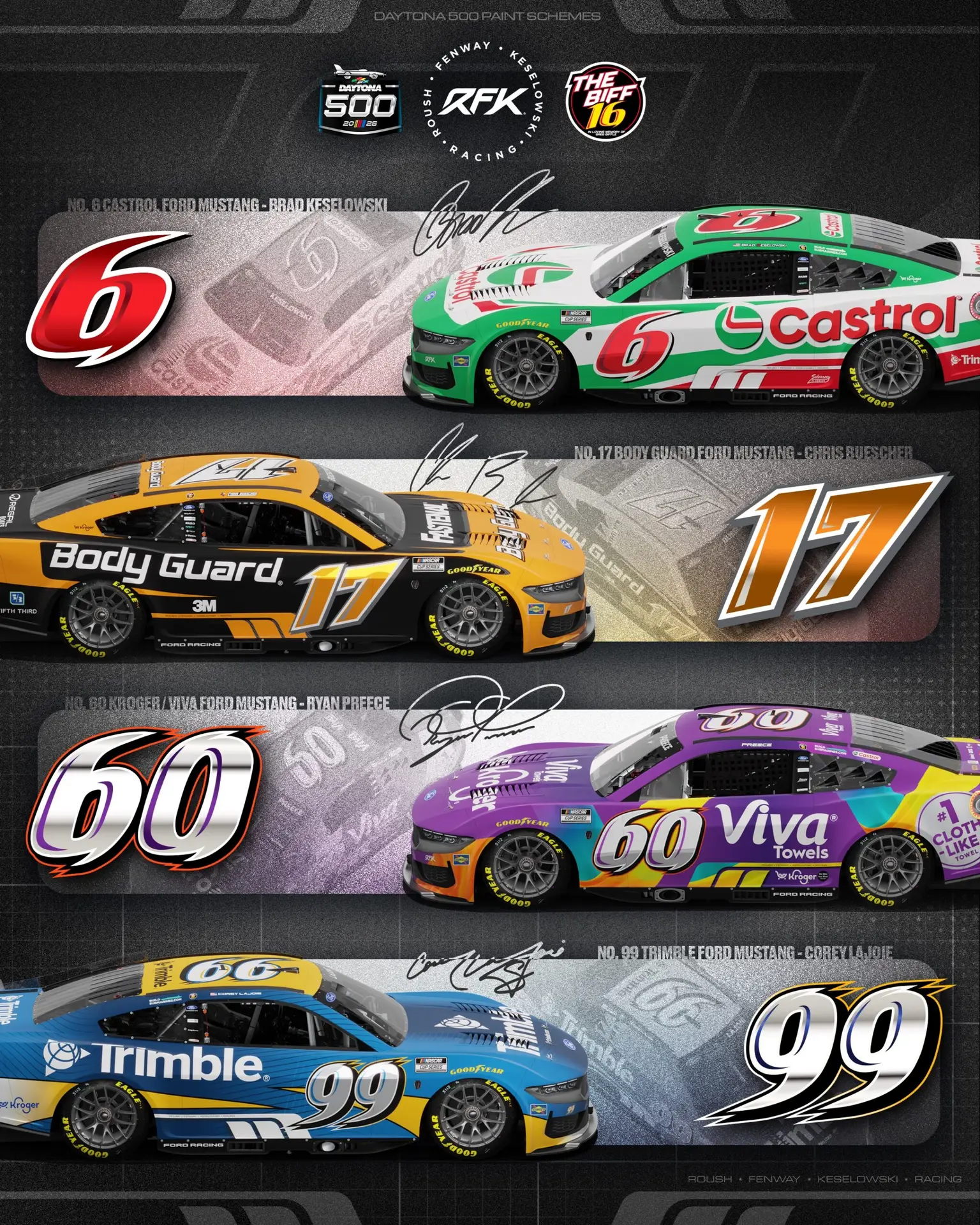 “Greg Biffle was more than a championship driver, he was family,” said RFK Racing co-owner Brad Keselowski. “He helped shape who we are as an organization, and his legacy is woven into this team’s history. Returning to the iconic numeric font that defined so much of his career, and adding the season long decal to each car, are meaningful ways for us to honor Greg and carry his spirit. We can’t bring him back, but we can honor him on the track the best way we know how, all season long.”