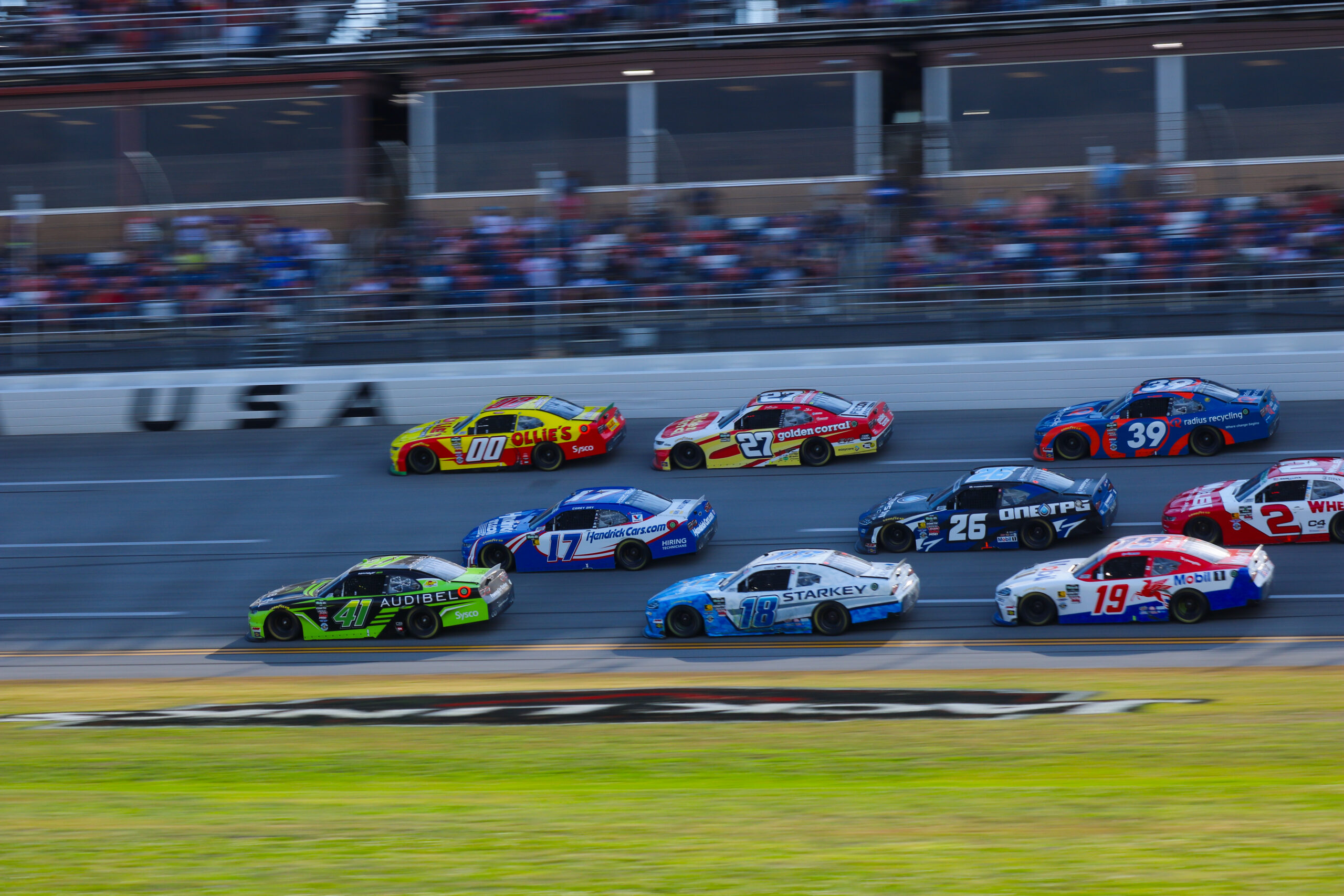 As the field entered Turn 1 on the final lap, Day drove in between the Haas Factory Team cars of Sheldon Creed and Sam Mayer. Day slid in front of Creed on the outside before Mayer was sent spinning to the apron by contact from William Sawalich. Brent Crews narrowly missed Mayer’s spin and surged his No. 19 Joe Gibbs Racing Toyota to second on the inside.