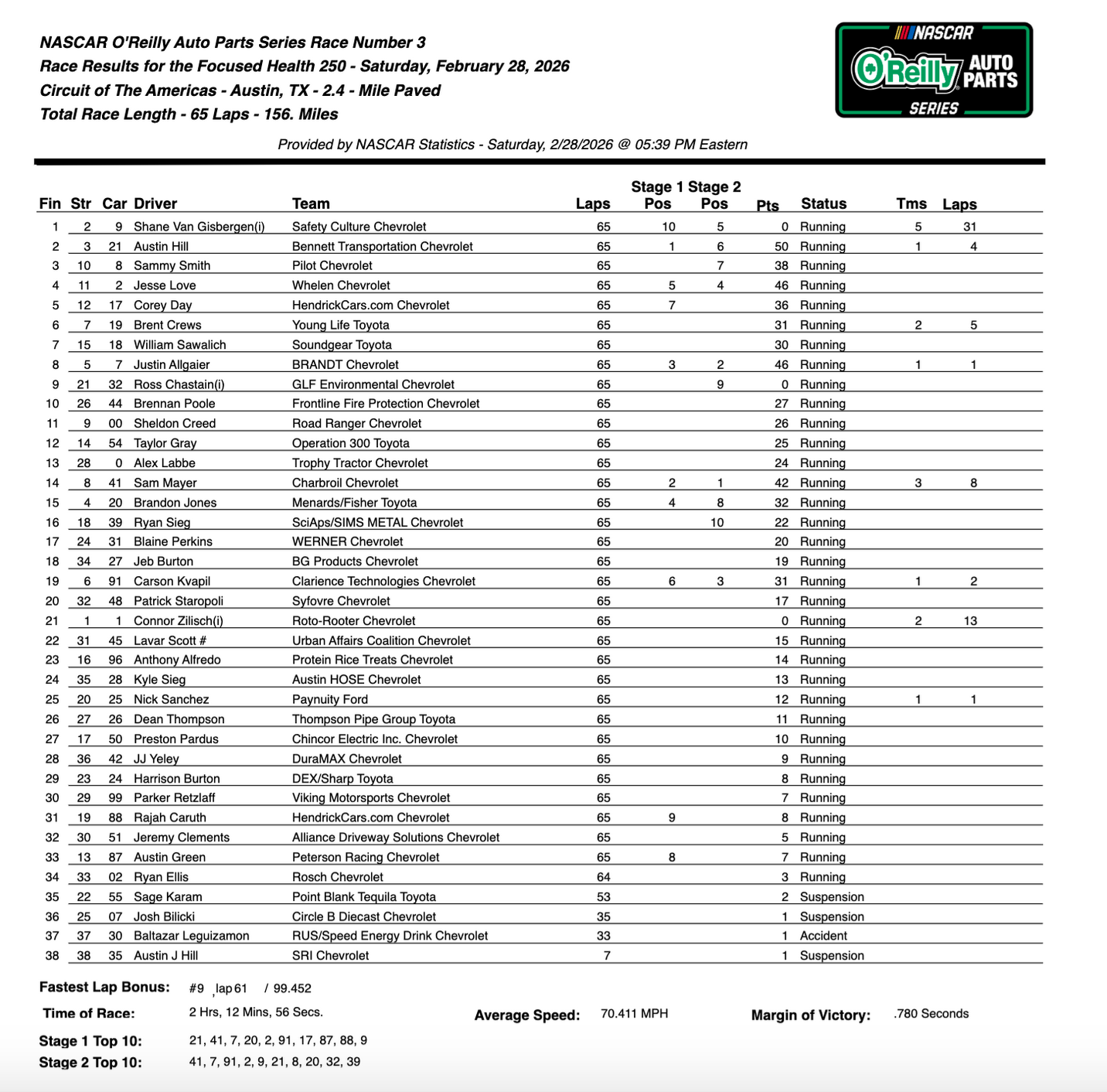 Austin Hill finished second in the No. 21 Richard Childress Racing Chevrolet, followed by Sammy Smith’s No. 8 JR Motorsports Chevrolet. Jesse Love finished fourth for RCR, followed by Hendrick Motorsports’ Corey Day to round out the top five.
