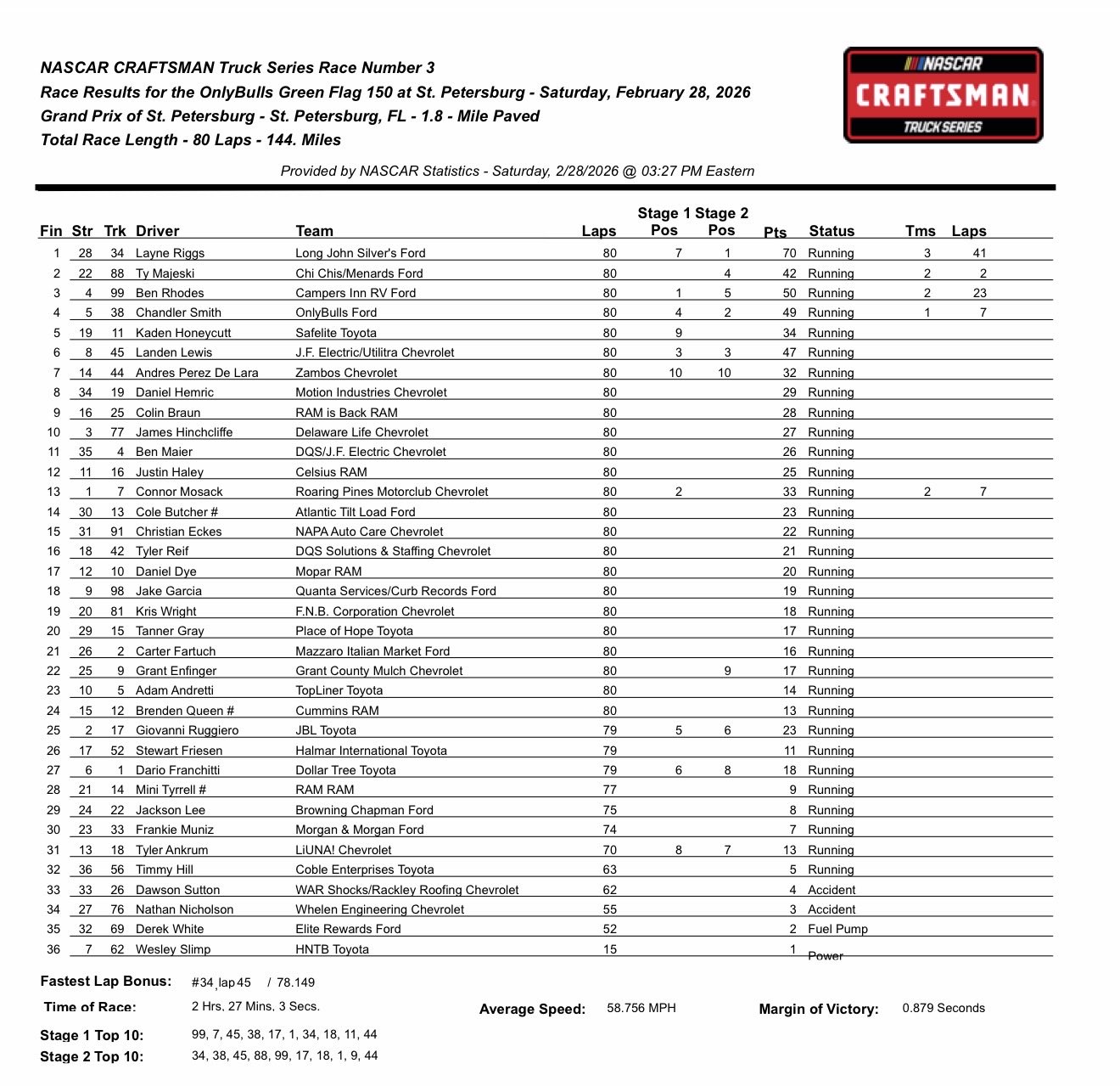 Layne Riggs won the OnlyBulls Green Flag 150 in St. Petersburg, Florida on Saturday, making him the first ever NASCAR Craftsman Truck Series street course winner. He secured the second win of this season for Front Row Motorsports, and the sixth of his own Truck Series career.